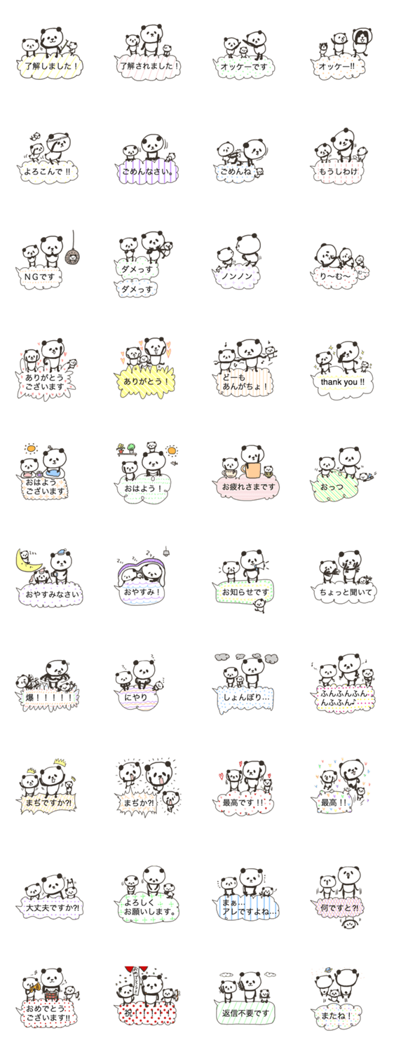 ぽわぽわの吹き出しにゆるいパンダさん達がまつわりついているスタンプです。