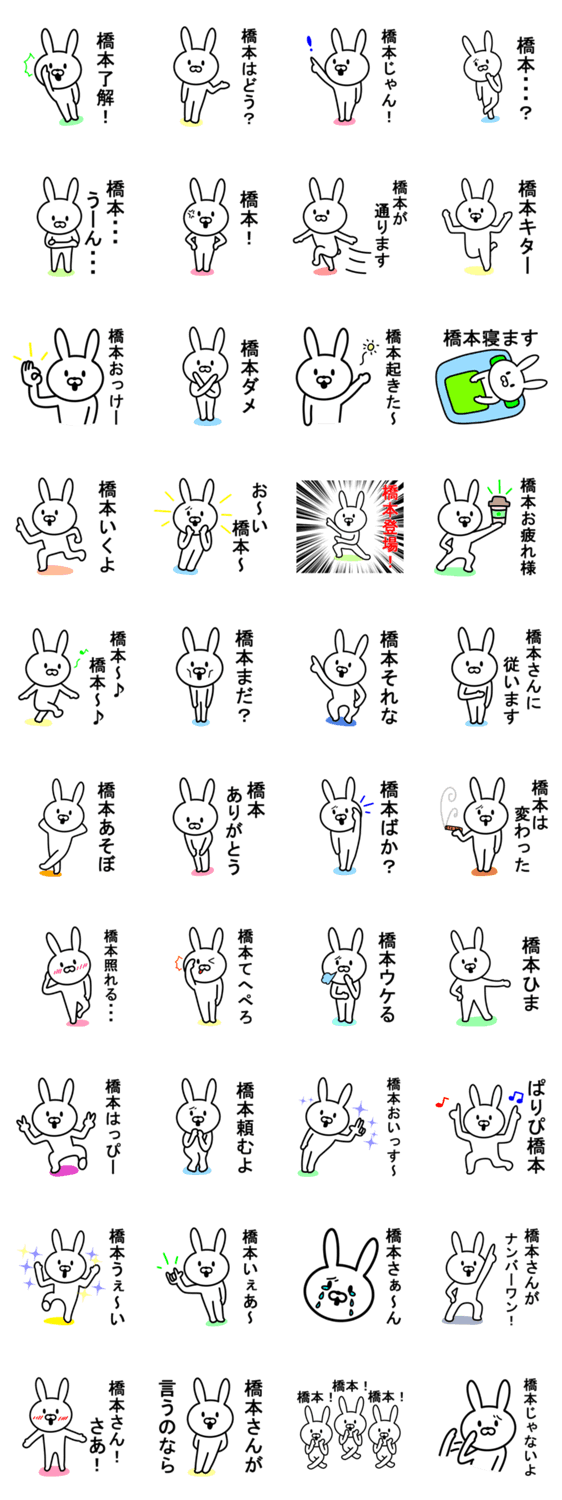 苗字が橋本(はしもと)さんに便利なウサギです。橋本さん本人はもちろん、橋本ではない人も使えます。色々な名字の人(鈴木、佐藤、高橋、田中さんなど)に使えるうさぎです。