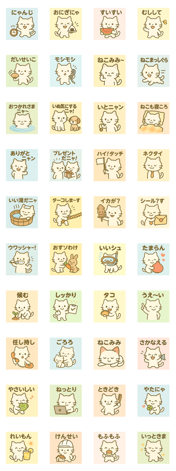 しろにゃんまるの駄洒落スタンプです。みんなでずっと使える内容を揃えましたのでスタンプ初心者の方にもオススメです。