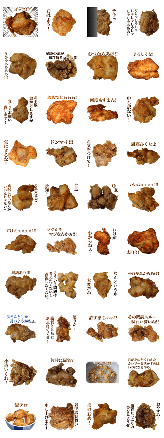 一年中、毎日使える唐揚げのスタンプです。日常で便利に使える感じにしました。カラアゲ、からあげ、フライドチキン、揚げ物、お正月にも、あけおめ。実写食べ物スタンプ。