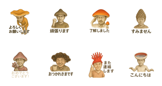 キノコ頭のおじさんたちが挨拶をするスタンプです。ゆるくてちょいキモカワ?クセのあるキノコたちが日常会話を楽しくします。少し気を使うべき相手に使える敬語対応です。