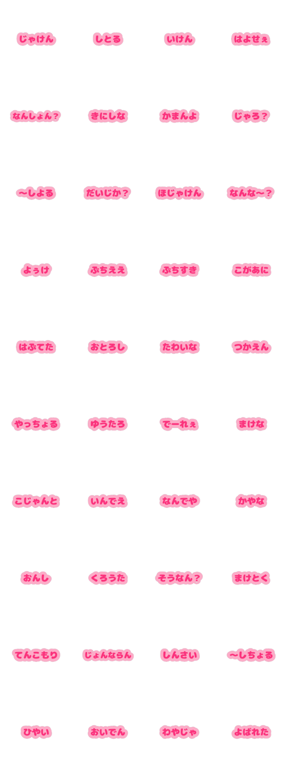 中国・四国エリアの方言風フレーズを、やさしいピンク文字で表現!背景なしでトークにも自然になじむ、使いやすいスタンプです。