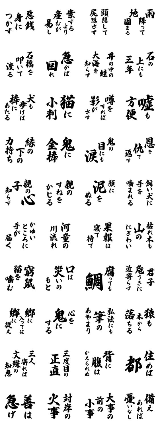 日本の諺(ことわざ)をシンプルな文字だけで表現した、使い方いろいろな使い勝手の良いスタンプです。文字だけだから返事やアレンジにも使いやすい!