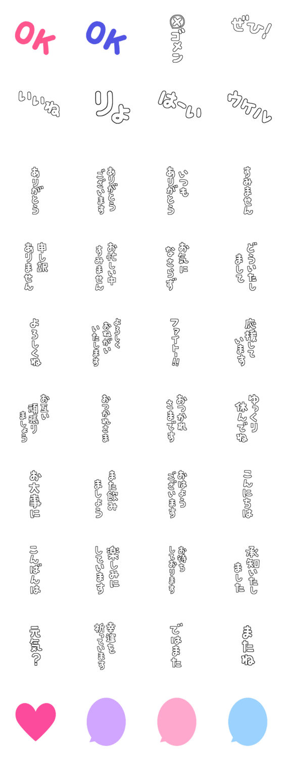 言葉だけのアレンジ向き定番基本セット。シンプルに単語と言葉のみ。吹き出しに重ねて使っても良いです。OKこんにちは等持っていると便利。黒フチの白文字。