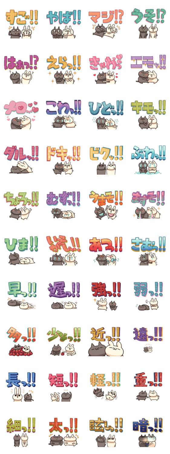 うさぎのしろとねこのくろのスタンプ第三十二弾です。大きな文字でびっくりをよりびっくり伝えます。