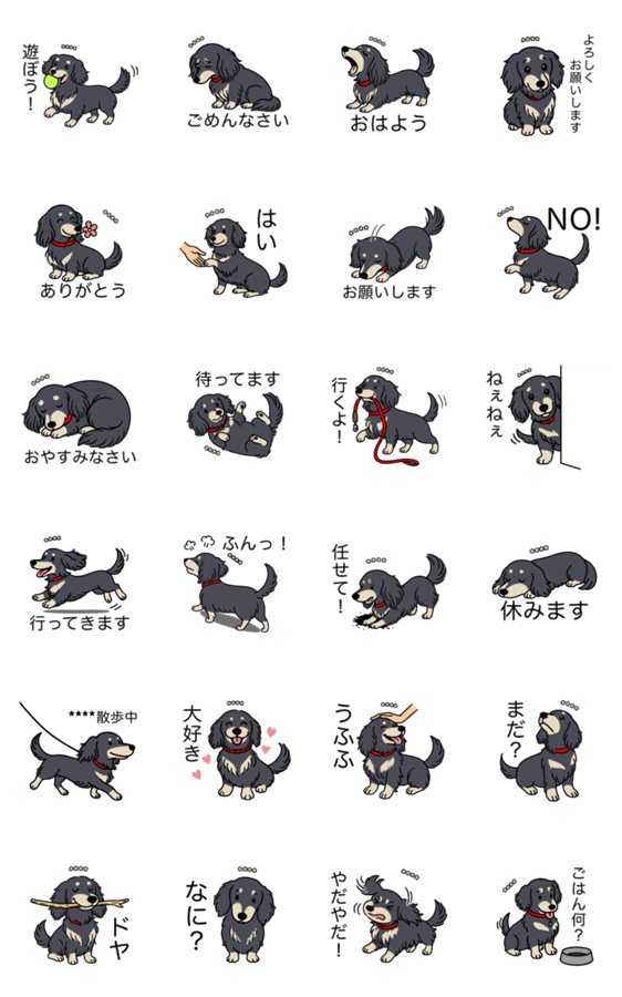 | スタンプ説明 | 愛犬お名前が入れられる!ミニチュアダックスロングコートブラッククリームバージョン |
