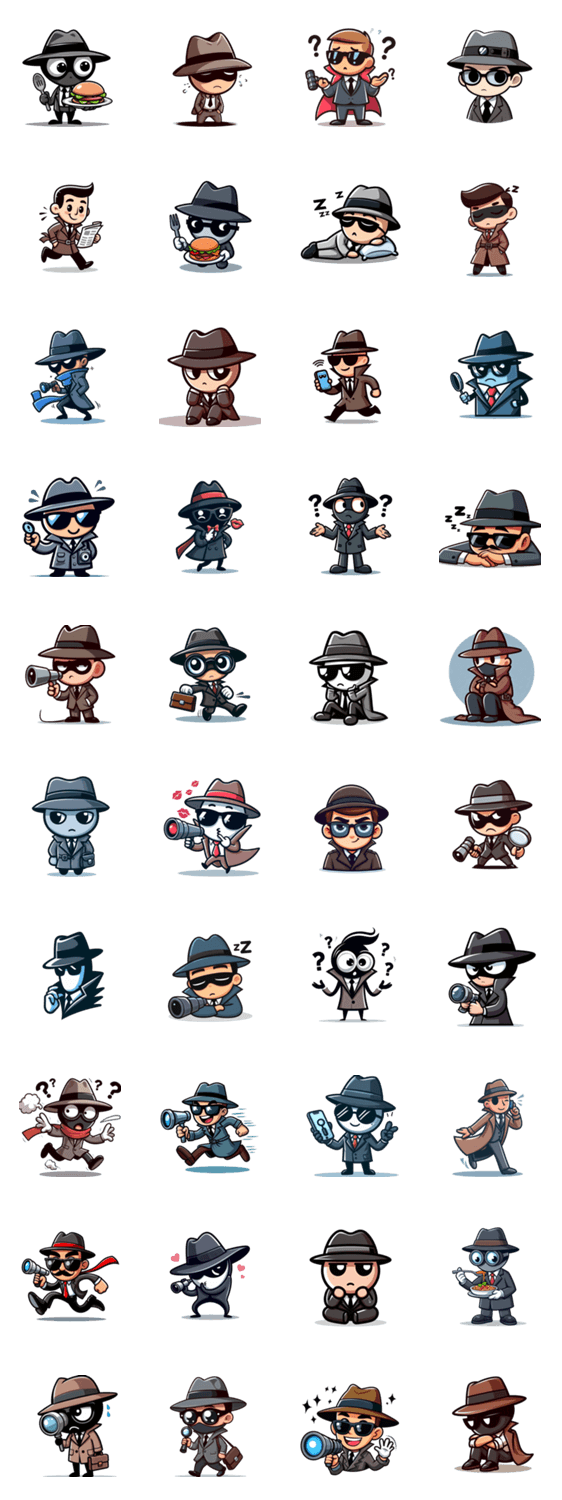 スパイテーマのカートゥーンステッカーでチャットにミステリーとワクワクを!秘密の共有やジョーク、潜入ごっこにぴったりです。