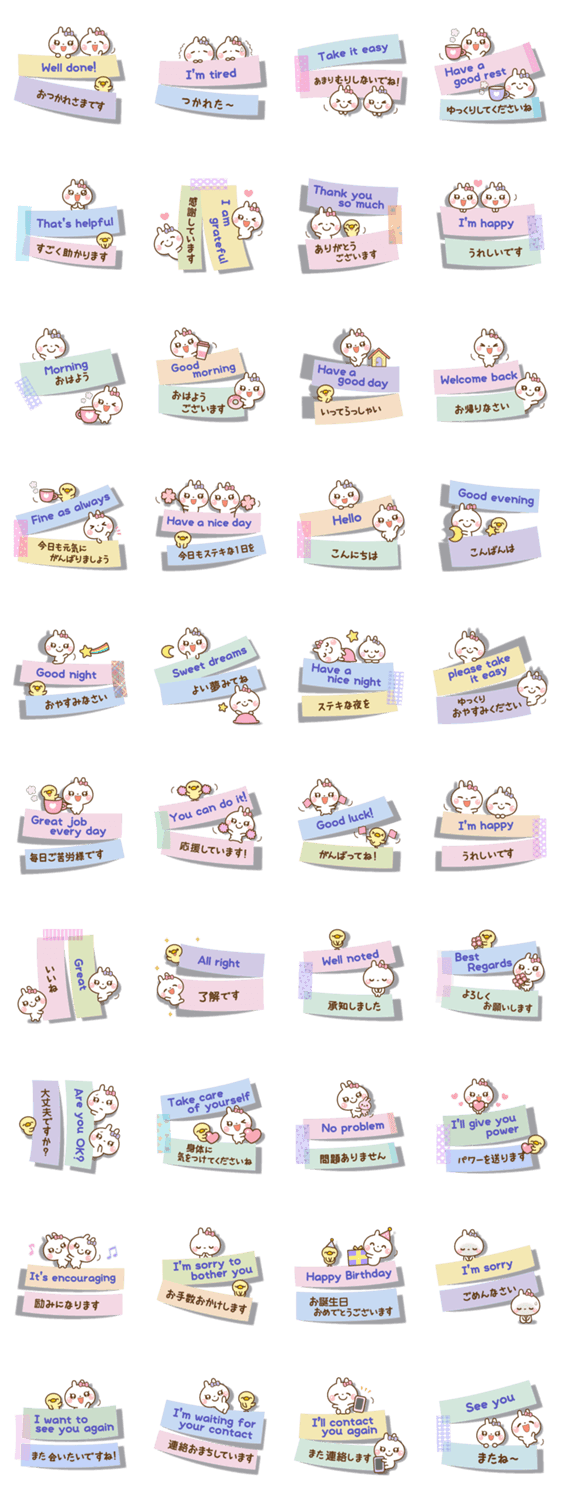 プチ耳BABYのやさしさ伝わる付箋タイプの[英語&日本語]版スタンプです♪やさしい気持ちが伝わるトークをセットにしました♫