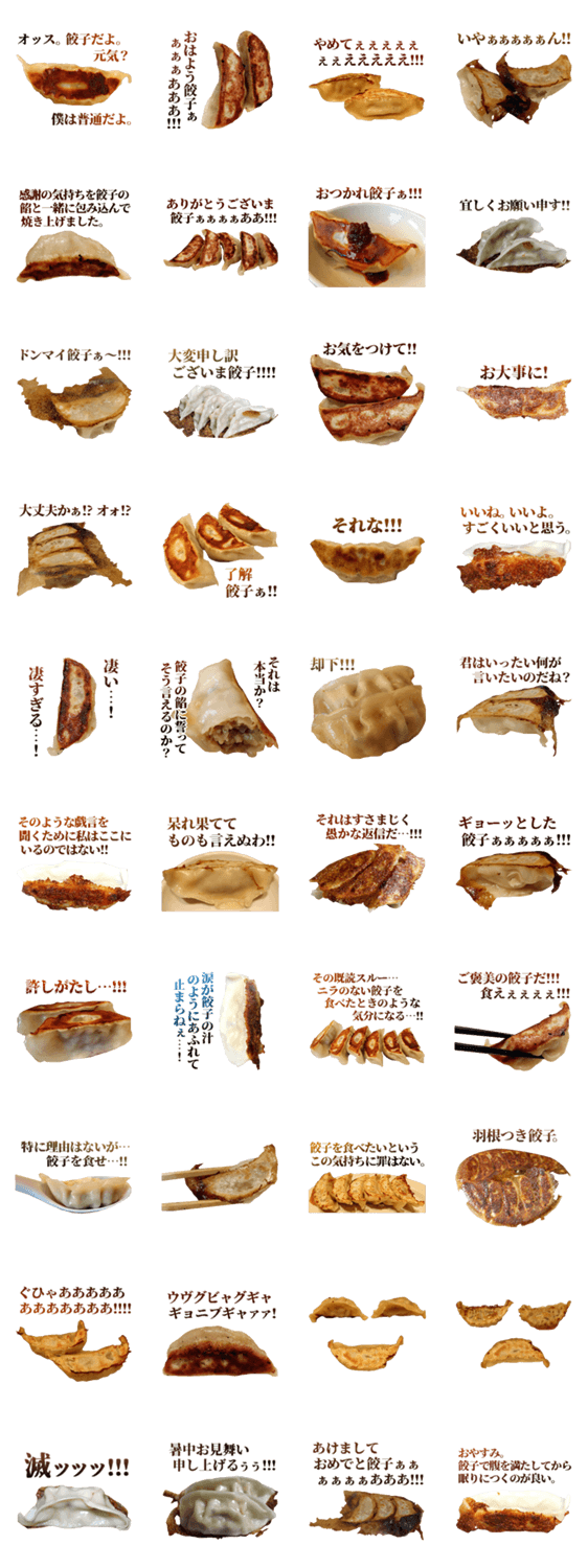一年中毎日使える餃子のスタンプです。日常会話で使いやすいです。ぎょうざ、ギョウザ、ギョーザ、中華料理、焼き餃子、面白い、お正月、暑中お見舞い。実写食べ物スタンプ