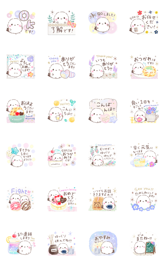 着せ替えでも人気のふわもちしまえながシリーズ、No21。毎日使える思いやり言葉。基本の挨拶.感謝.お祝いおめでとう.労いなど。ずっと使える定番、基本セット。