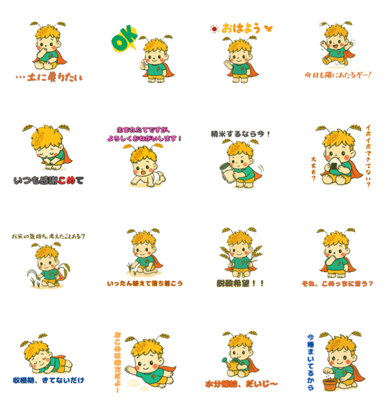稲の妖精、こめっちが、笑ったり、照れたり、元気をくれたり。どんなシーンにも寄り添ってくれるスタンプです。