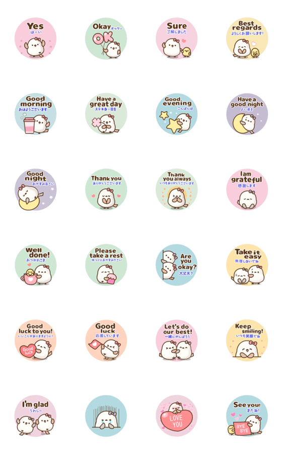 可愛いリボンを付けたトリボンの「英&和」版スタンプです! やさしさや思いやる気持ちが詰まったスタンプです。ピヨちゃんも応援出演していますよ〜♫