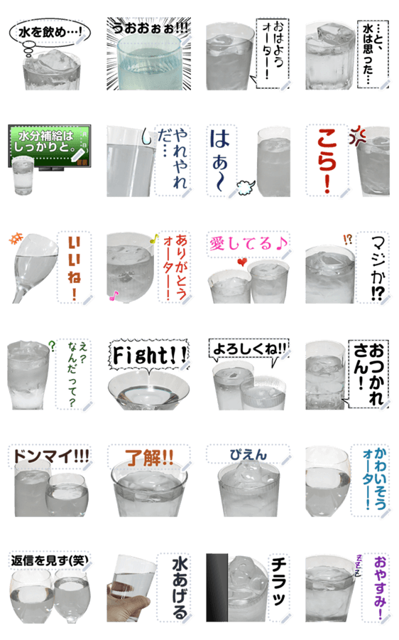 文字、文章を自由に設定できる水のメッセージスタンプです。飲料水、ウォーター、Water、ドリンク、夏、汗、熱中症、水分補給を忘れずに。実写飲み物スタンプシリーズ。 現在この商品は一部のスマートフォン版LINE 10.3.0以上のトークルームでのみ使用できます。動作環境の最新情報はヘルプをご確認ください。