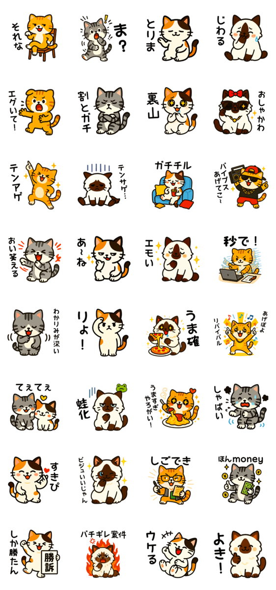 ギャル語でトークはバイブス爆上げ! かわいいネコたちが「それな」「しか勝たん」「ほんmoney」など最新ワードで、あなたの気持ちを盛り上げます。