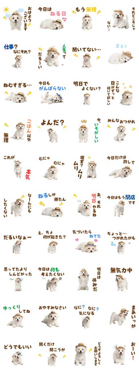 ふんわりかわいいマルチーズの子犬が、日常で使いやすい言葉をぎゅっと詰め込んだスタンプです。あいさつから気持ちまで、毎日送りやすくて便利♪