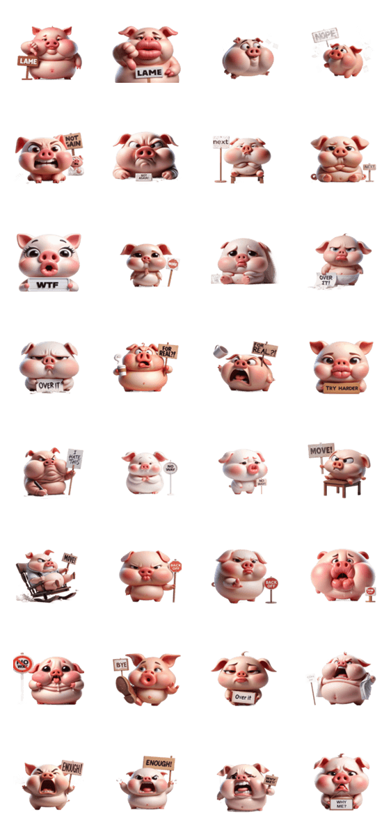 プンプン厚い唇のピンクぶたスタンプ、かわいい、怒り、遊び心、面白い、ユーモア、動物キャラ、イラスト、チャット、LINEスタンプ、