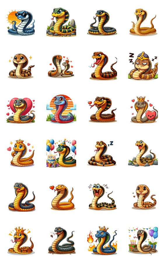 会話を盛り上げるキングコブラのカートゥーンスタンプ!かわいさと迫力をあわせ持ち、ユニークで楽しい表情をたくさん届けます。