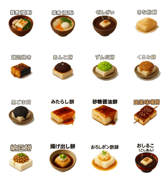 雑煮・ぜんざい・磯辺焼き… “日本のもち”16種をリアル再現。タイトル入りで一目で伝わる!