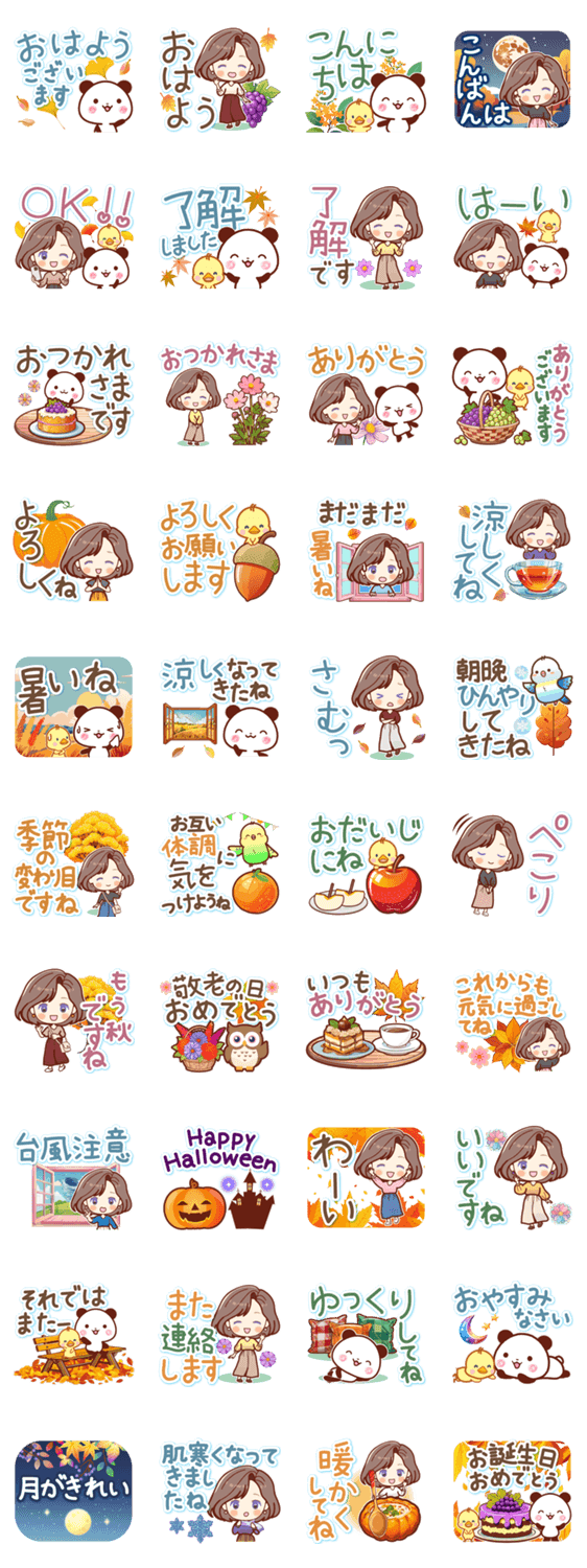 秋冬にずっと使える♡人気のふんわり女子とパンダ&ひよこのかわいい日常♪挨拶/敬語/紅葉/スイーツ/敬老の日/ハロウィン/寒い/大人女子/女の子/主婦/家族/シニア/インコ