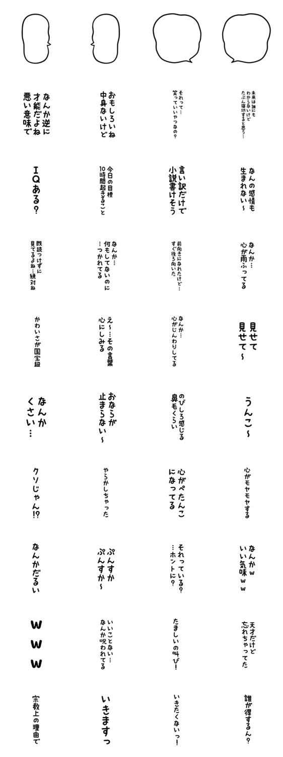他のスタンプと組み合わせて使えるスタンプアレンジ機能のついた吹き出し用セリフです。汎用性の高いネタ/面白い/彼氏/彼女/友達/学生/毒舌/ネガティブ/シュール/ゲス