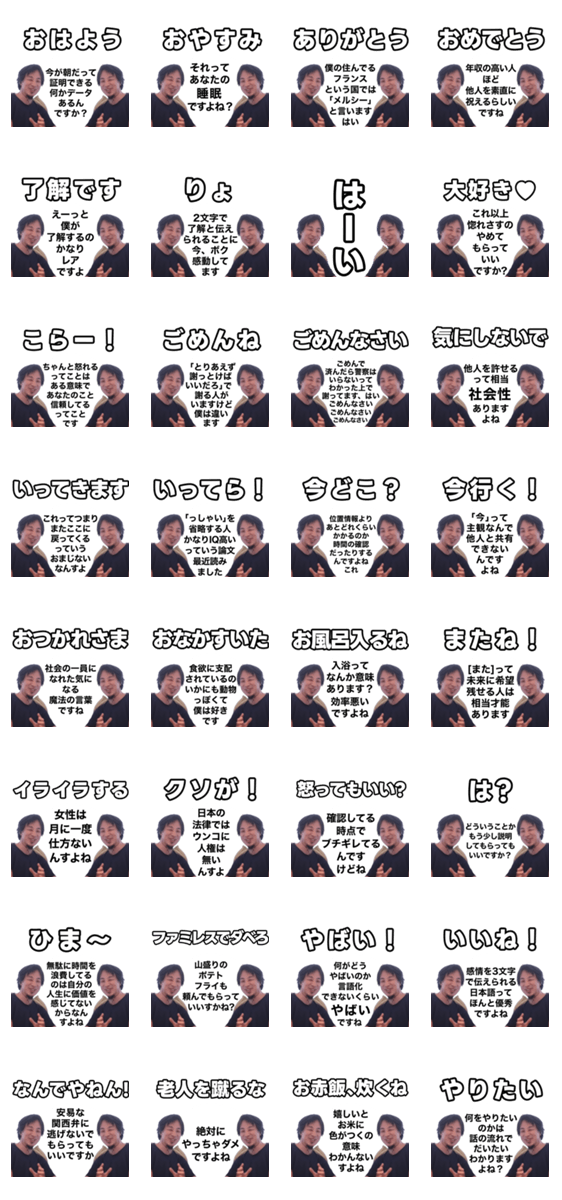 「2ちゃんねる」の創設者・ひろゆきがダブルになって新登場!日常会話を盛り上げる!一体でもお得なのに、二体になってさらに加速!浮いたお金でフランスに移住しちゃおッ ※LINE Creators Collaboration ひろゆきのコラボ参加スタンプです。