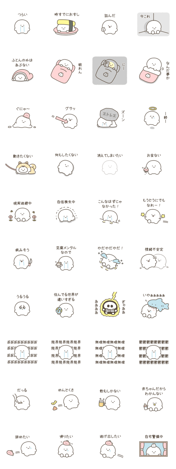 こつぶちゃん第7弾。マイナス思考/無気力/現実逃避/自信喪失/辛い/だるい/ストレス/豆腐メンタル/メンヘラ/寂しい/情緒不安定/病み/鬱/うつ病/不眠症/絶望/寿司/かわちい