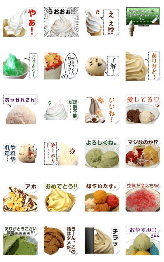 文章、文字を自由に変更できるアイスのメッセージスタンプです。アイスクリーム、ソフトクリーム、かき氷、Ice、パフェ。実写食べ物スタンプシリーズ。 現在この商品は一部のスマートフォン版LINE 10.3.0以上のトークルームでのみ使用できます。動作環境の最新情報はヘルプをご確認ください。