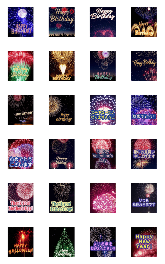 背景に打ち上がるverです。華やかな誕生日と季節イベントで一年中使えます♪バレンタイン/結婚/母の日父の日/ハロウィン/暑中見舞い/クリスマス/年末年始お正月/年賀状