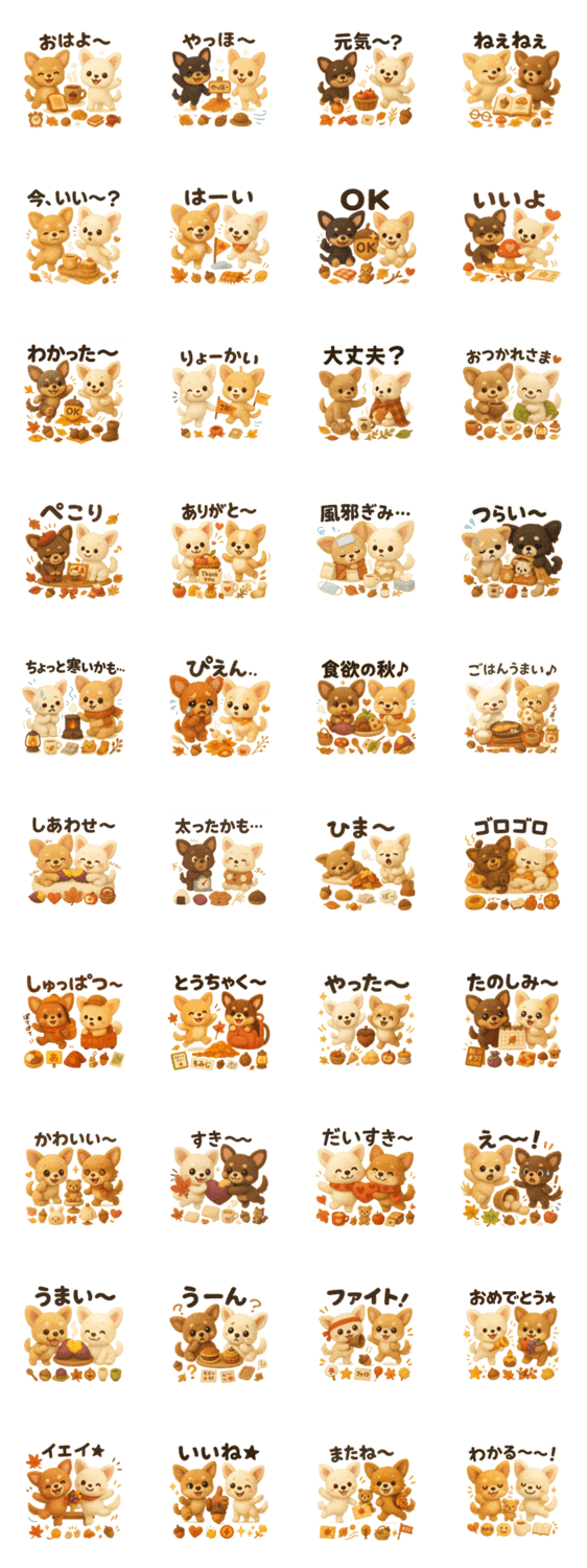 食欲の秋、お昼寝の秋。甘えんぼなチワワたちが、ぬくぬく&ほっこりの癒しをお届け。やさしくて、かわいくて、ちょっと笑える秋スタンプです。
