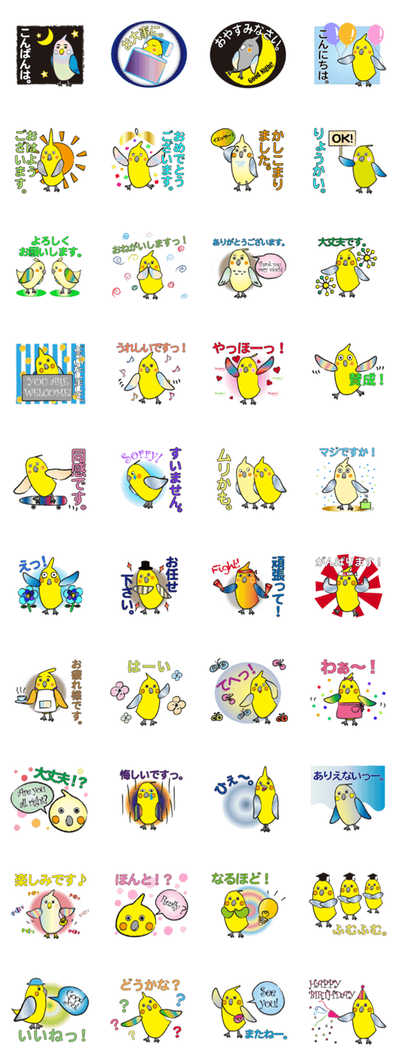 日常会話で使いやすいフレーズがたくさん♪「鳥好きの方に楽しんで頂けるようなトリさんスタンプを!」と思い、制作しました♪おとぼけ顔のオカメインコをお楽しみ下さい。