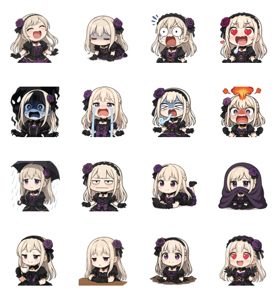 ゴシックキャラの可愛くて楽しい表情が大集合!ぷんすか顔、びっくり顔、にっこり笑顔、泣き顔まで。毎日のトークを盛り上げるコミカルでユニークなスタンプセットです。