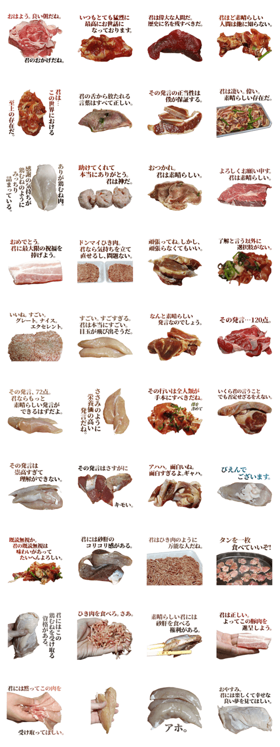 生肉が相手のすべてを肯定するスタンプです。肯定は人類最強のコミュニケーション。牛肉、豚肉、鶏胸肉、ひき肉、ミート、タンパク質、飯テロ。実写食べ物スタンプシリーズ