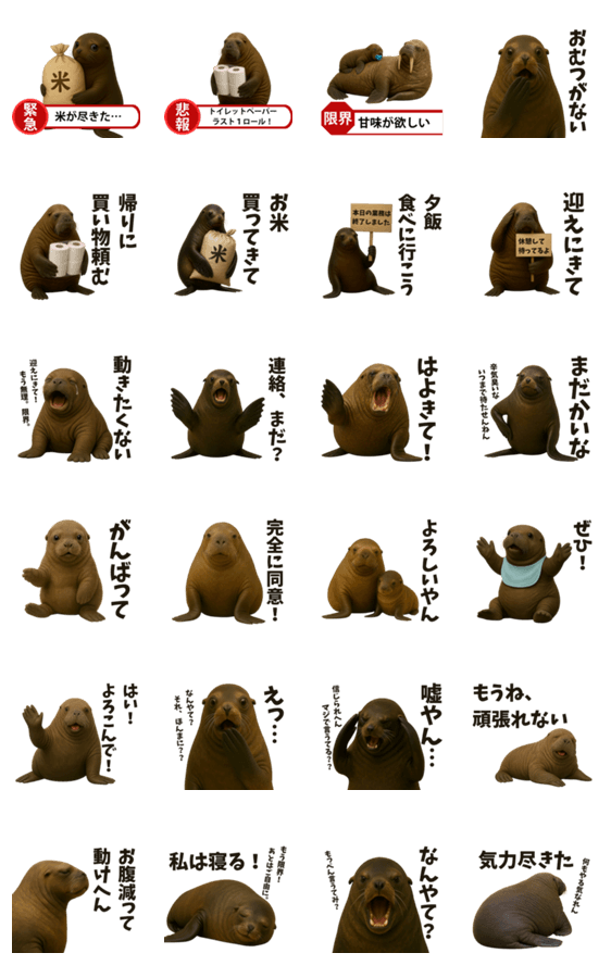 母の日常をセイウチとオットセイが代弁! 「お迎えきて」から「がんばって」まで、 家族や友達とのやりとりにぴったりな、母視点のゆるっと使えるスタンプです。