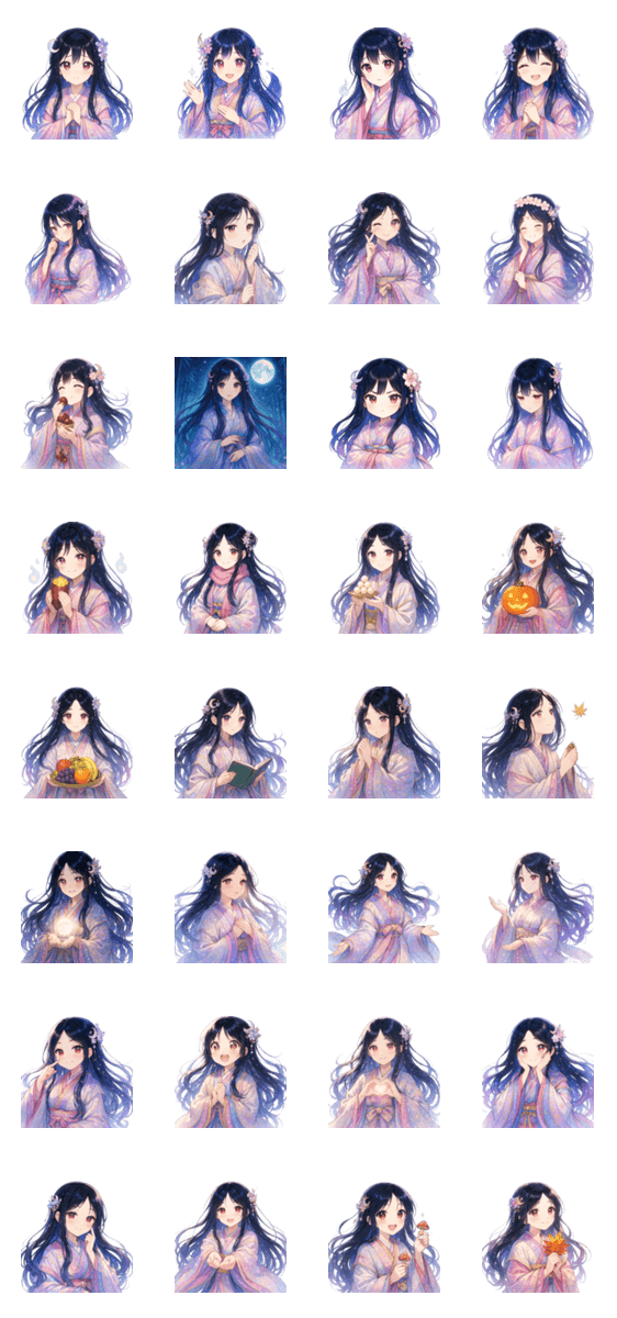 秋のかぐや姫が、笑顔・ウィンク・涙・照れ笑いなど感情たっぷりのキュートな表情であなたのトークを彩ります。幻想的で可愛い秋スタンプ!