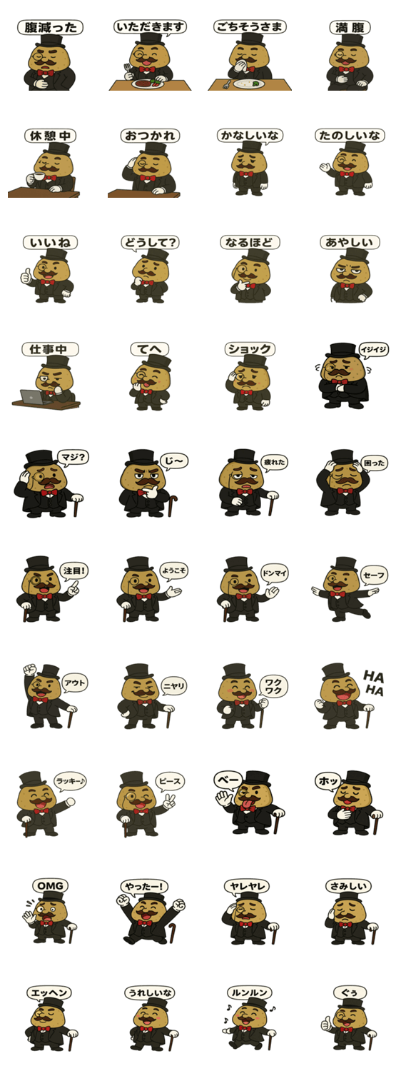 ユーモラスなじゃがいもキャラクター「いも男爵」スタンプ第2弾。 さらに多彩な表情とセリフで、トークをもっと楽しく盛り上げます。