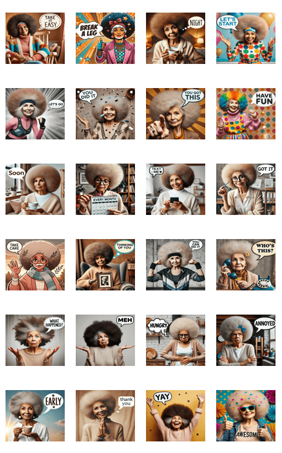 さまざまな感情を表現するアフロおばあちゃんのスタンプセットです。温かい会話にぴったりです!