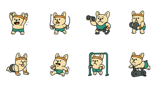 クリーム色のフレブルがジムでトレーニング ダンベル なわとび ヨガマット バイク タオル 多彩なポーズで毎日のチャットを楽しく