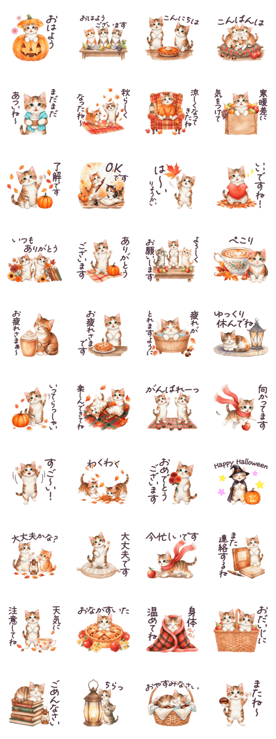 水彩風の猫のスタンプ。毎日/連絡/挨拶/敬語/丁寧/グループ/家族/友達/PTA/ママ友/猫/ねこ/ネコ/子猫/子ねこ/秋/紅葉/ハロウィン/でか文字/文字大きめ/老眼/シニア