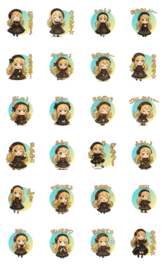 ゴシックでかわいい少女のスタンプです。笑ったり、拗ねたり、ちょっぴり魔法を使ったり…いろんな表情でトークを彩ります♪