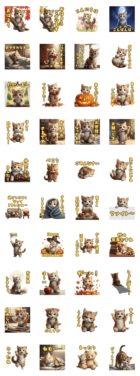 ふんわり可愛い長毛三毛猫が、秋の紅葉や銀杏と一緒にごあいさつ。毎日使えるスタンプです♪挨拶からリアクションまで幅広く使え、秋の会話をもっと楽しく彩ります。