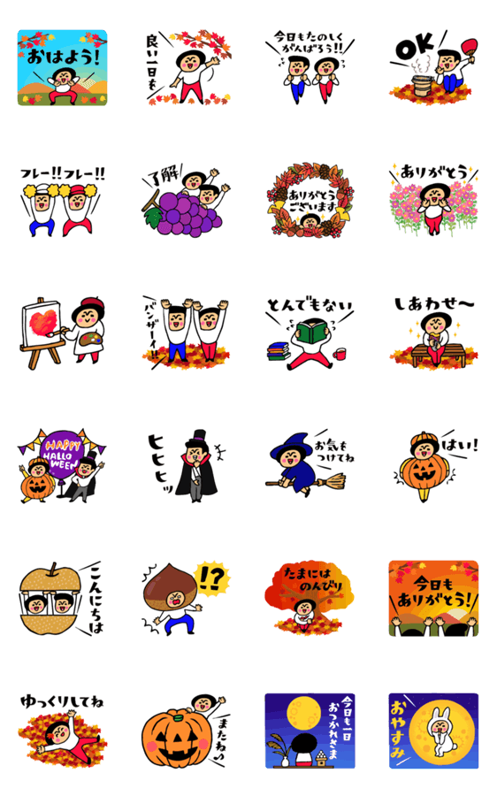 トモダチトークスタンプより、秋に毎日使える動くスタンプの登場です!彩り豊かな楽しい秋を過ごしましょう♪(挨拶/紅葉/ハロウィン/ぶどう/芸術/夕焼け/)