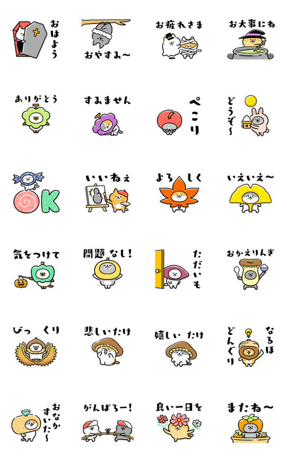 秋っぽいものにコスプレした猫たちの日常系スタンプです。