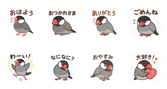 かわいい文鳥の日常をお楽しみください!日常会話をほんわか癒してくれる、かわいいスタンプです。毎日のトークがもっと楽しくなります