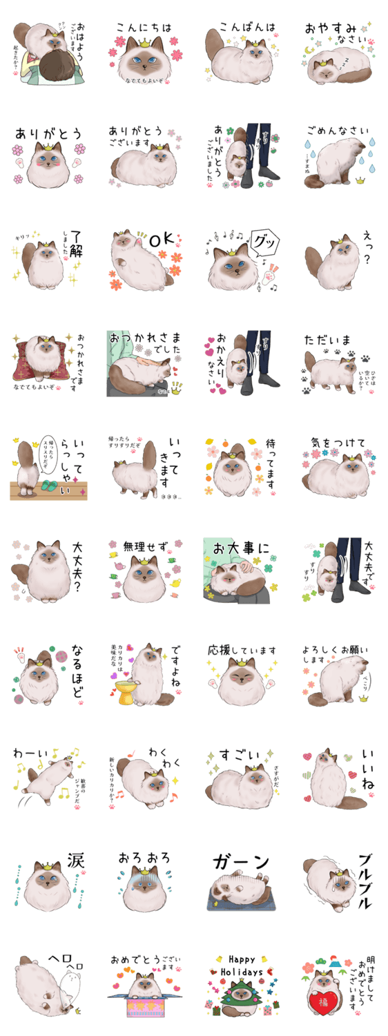 王様のようにゴージャスなもふもふ猫のスタンプです。日常のあいさつや気持ちを伝えられます。