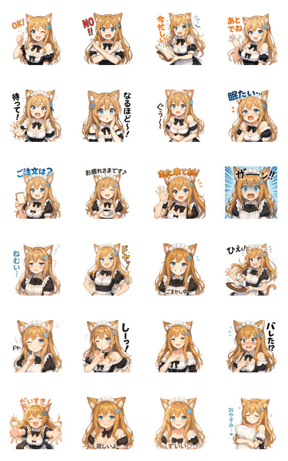 キュートで元気なネコ耳ウェイトレスが、驚き・喜び・怒り・おねだり・失敗など、コミカルな表情で感情爆発!会話を盛り上げる使いやすい表情が満載のスタンプセットです!