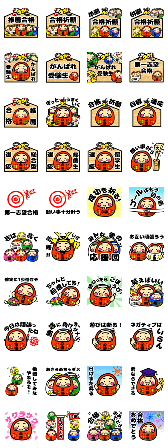 受験生を全力で応援するスタンプです。幸運だるまと一緒に頑張る人を応援しましょう。(だるま、合格、合格祈願、ポジティブ、応援、必勝、中学受験、高校受験、大学受験)