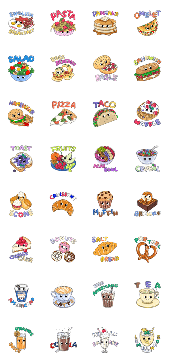 週末のブランチの会話にぴったりな、かわいい32種類のスタンプセットです。ブランチメニューやデザート、ドリンクまでカラフルに楽しく表現しています。