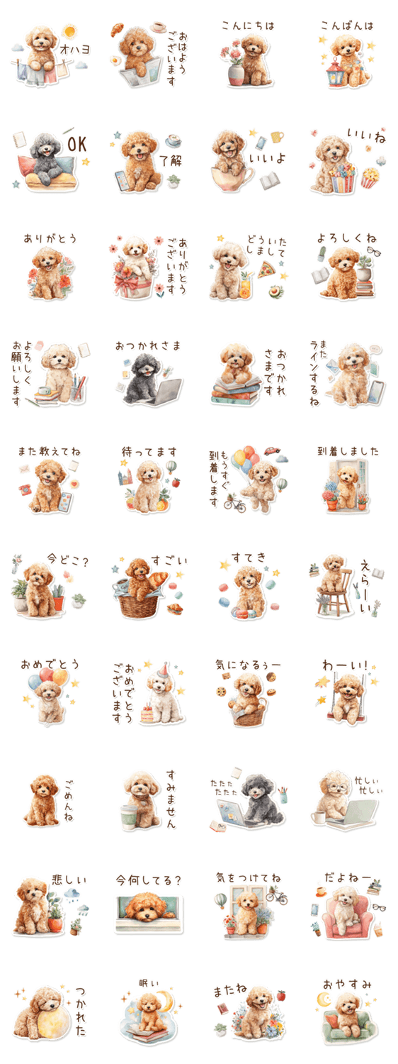 ふんわりやさしい水彩画・ステッカー風の子犬トイプードルの癒しスタンプです。トイプードルが日常に癒しをお届けします♪