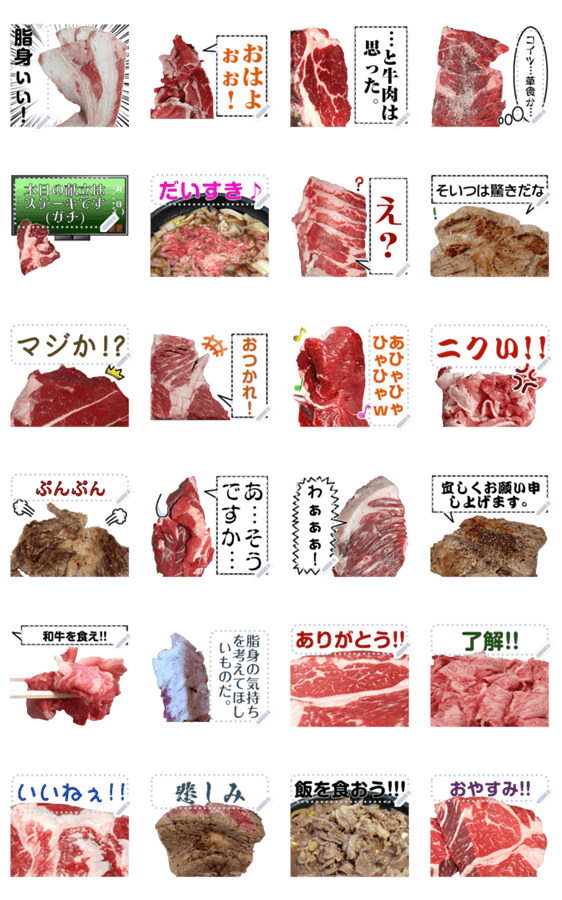 自由に文章や文字を変更できる牛肉のメッセージスタンプです。ビーフ、Beef、ステーキ、すき焼き、生肉、赤身、脂身、脂肪、お肉、飯テロ。実写食べ物スタンプシリーズ。 現在この商品は一部のスマートフォン版LINE 10.3.0以上のトークルームでのみ使用できます。動作環境の最新情報はヘルプをご確認ください。