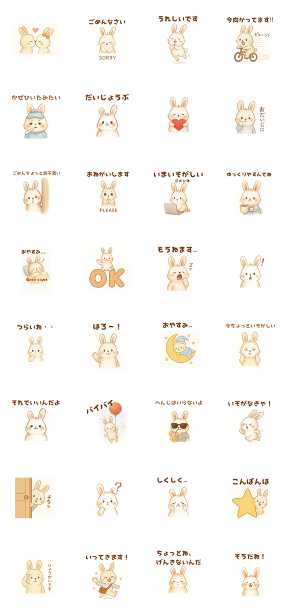 癒し系のかわいい「うさ」の毎日使えるスタンプセット あいさつ・リアクション、やさしい気持ちを届けます 友達とのトークを明るく、楽しく、ちょっと癒やし系に